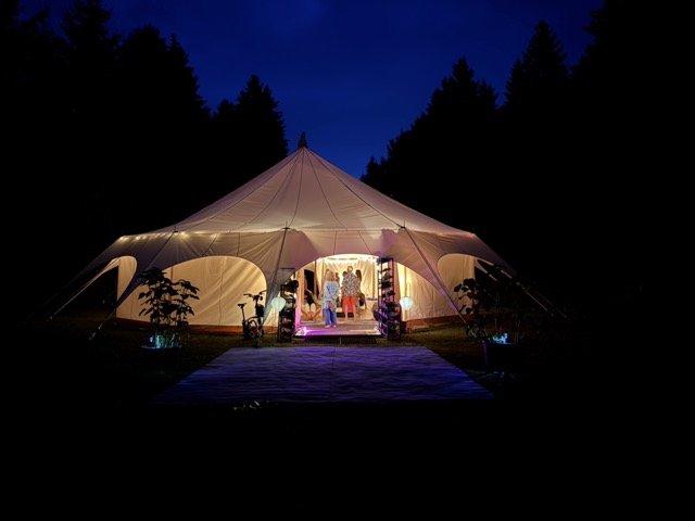 A large open-air tent available during the warmer months — ideal for gatherings, ecstatic dance, movement practices, and ceremonies that benefit from a connection to nature. Spacious and flexible, the tent extends Trimurti's capacity outdoors while keeping participants sheltered.